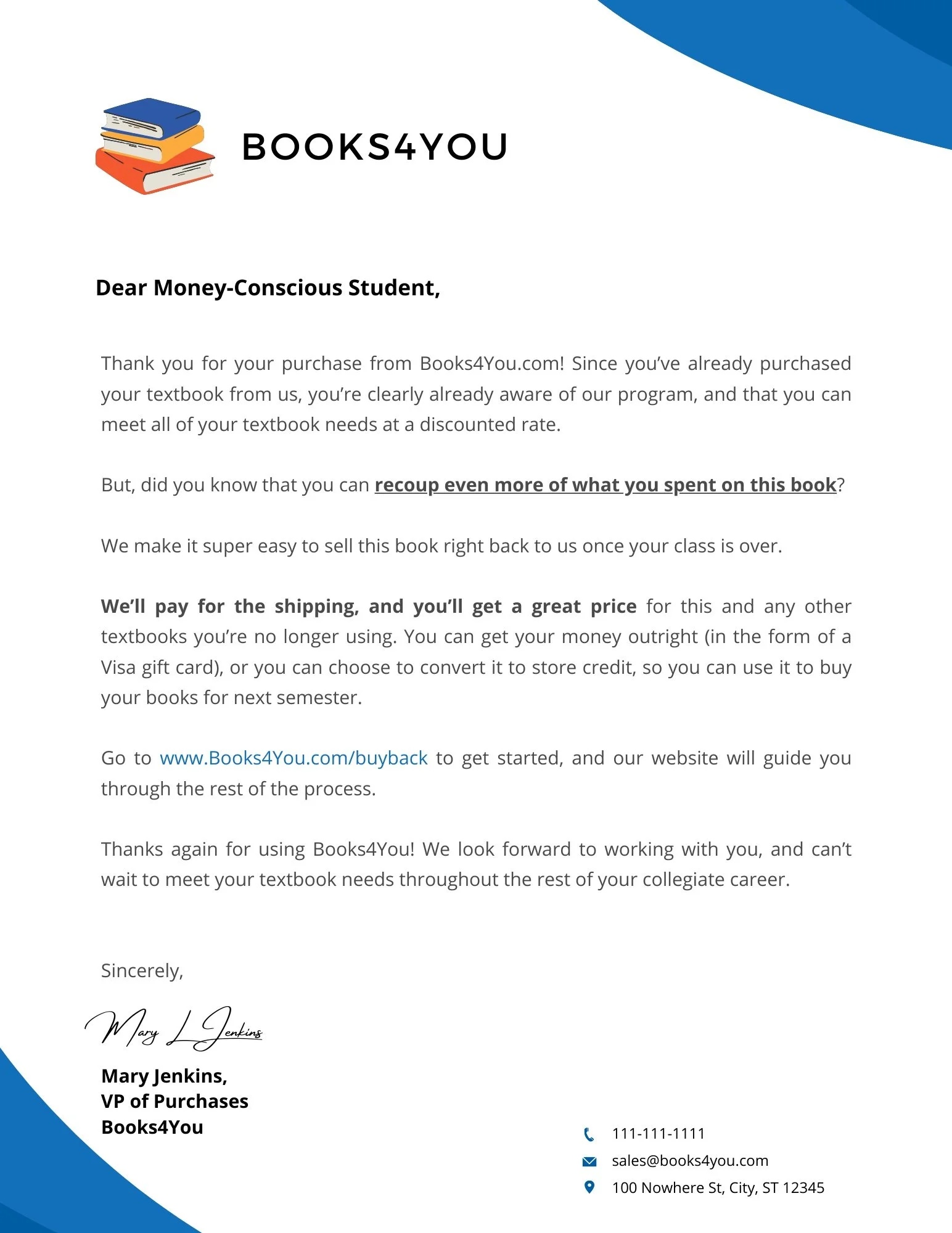 The problem: Books4You needed a sales letter that would be included with each purchased textbook. This letter would encourage their customers to both sell their textbooks back to them and to continue using them for future textbook purchases.